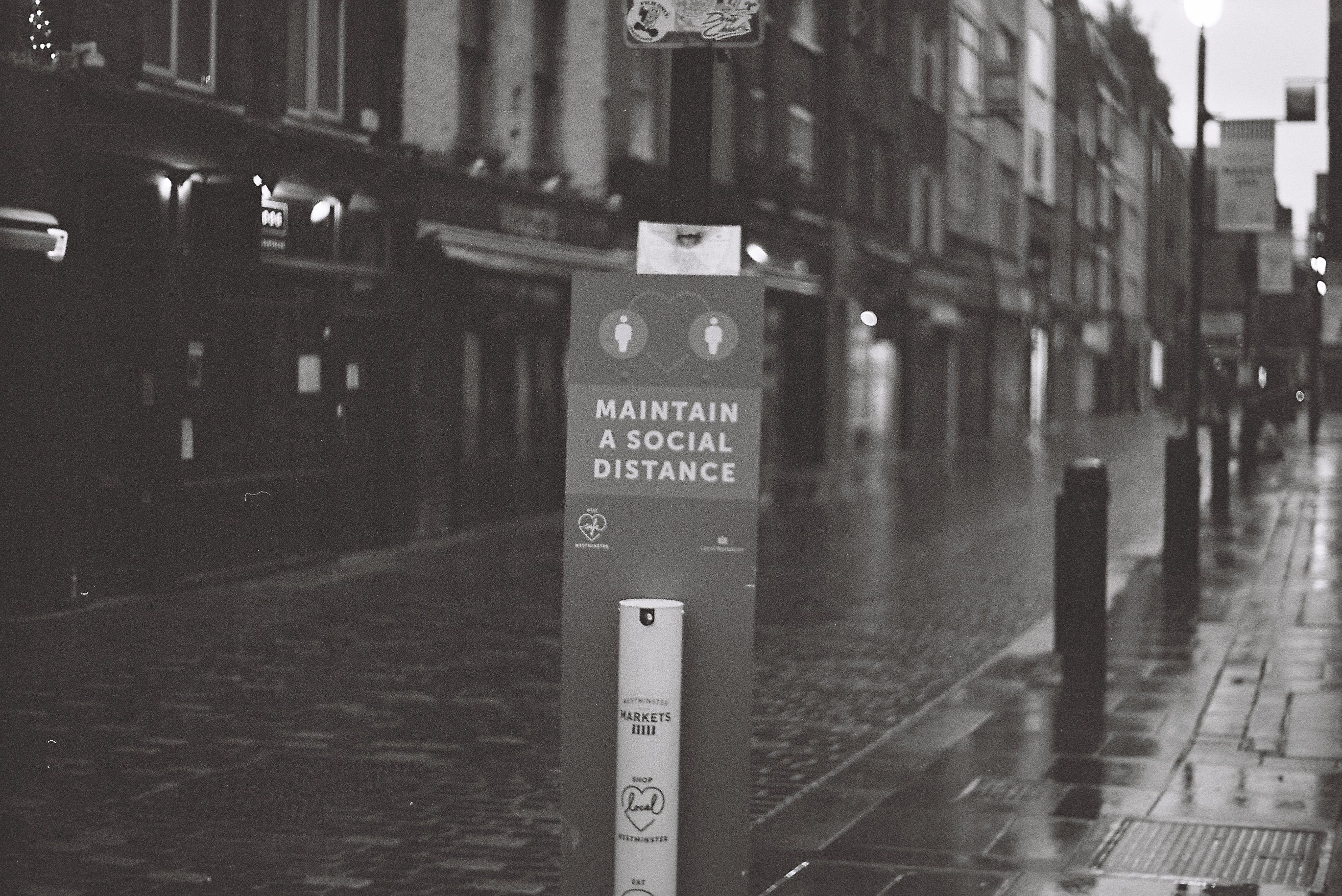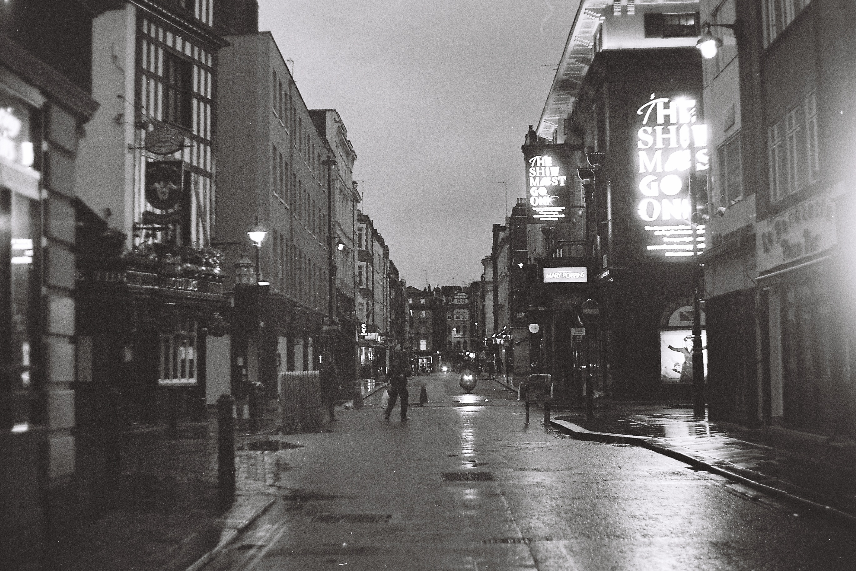 These photographs are part of a collection of films exposed during the COVID 19 Lockdown. Venturing down into an eerie London town for my daily exercise, it became apparent how much the urban environment requires constant use and at least maintenance so as not to fall rapidly into a state of decay. While most people were at home, those who serviced the lightbulbs in public spaces were still sent out to work. The cleaners were still required at the vast office blocks and the trash was still collected along these empty streets. The empty theatre was still lit up as if invisible actors inside may play to a full house of phantoms in some strange nightmare. Out of the city, in the orchards of Kent… the trees gave less fucks.